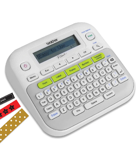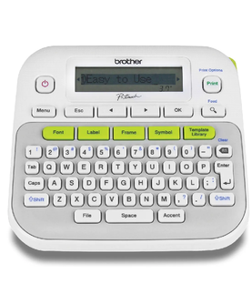 he Brother PT-D210 labeller, with one touch keys to quickly access 14 fonts, provides over 600 symbols and 98 frames making label printing a breeze. The fast and easy to use PT-D210 labeller prints laminated labels 3.5, 6, 9 and 12mm wide for durable and professional results. Quickly and easily create stylish labels using 27 pre-designed layouts and preview your label with the graphical display before printing. From labelling file folders and cables and wires to making gift tags and scrapbook pages, there are more uses than ever for the PT-D210.